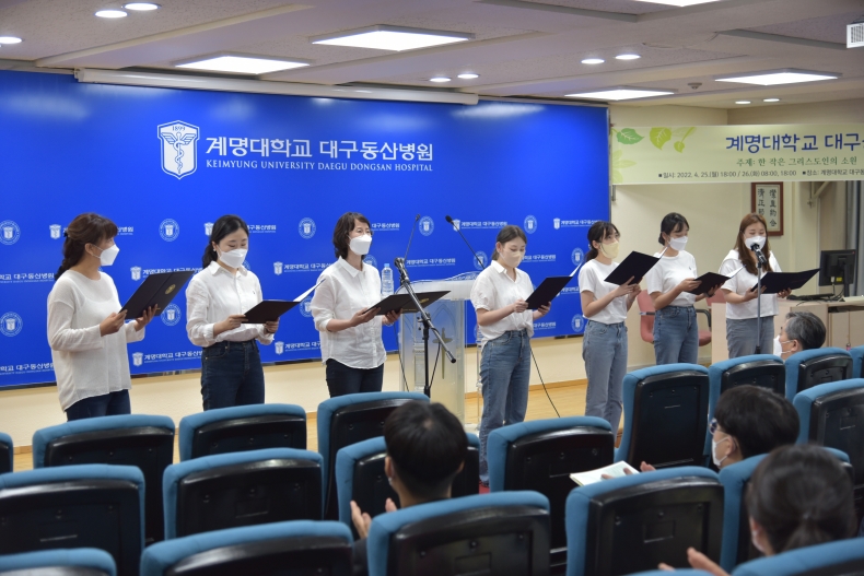 1. 일시 : 2022년 4 월 25일(월) 오후 6시 26일(화) 오전 8시, 오후6시 2. 주제 : “한 작은 그리스도인의 소원” (사도행전 20:24) 3. 장소 : 계명대학교 대구동산병원 마펫홀(3층) 4. 강사 : 김운성 위임목사(서울 영락교회) 5. 주관 : 계명대학교 대구동산병원 원목실 6. 협력 : 사단법인 동산의료선교복지회 |