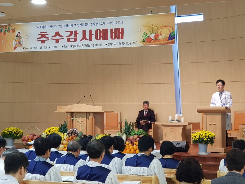 2019년 추사감사예배(동산병원) ▶일시 : 2019년 11월 13일 오전 8시 ▶장소 : 계명대학교 동산병원 5층 예배실 ▶인도 : 김진희 선교복지회장 ▶기도 : 안근수 선교복지회 총무 ▶설교 : 김승학 목사(안동교회) |