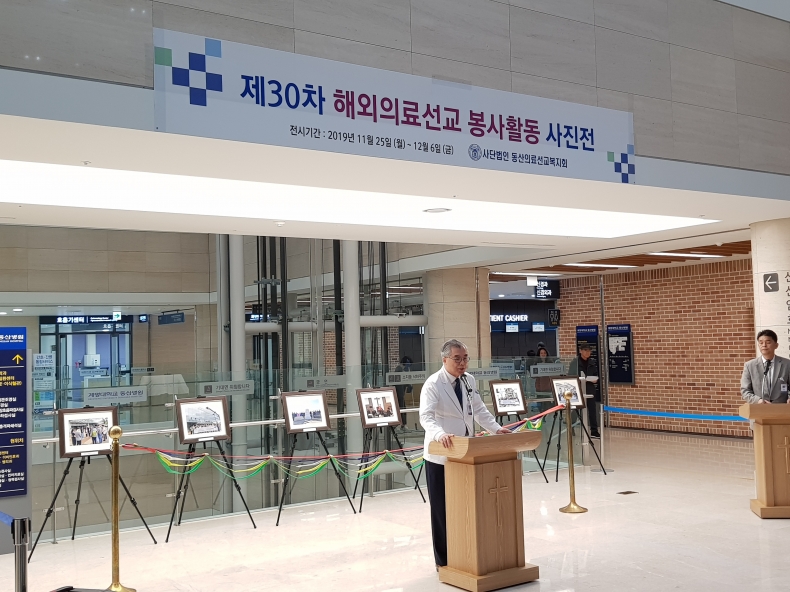 ※ 제30차 해외의료선교 봉사활동 사진전 및 커팅식 ▶ 일시 : 2019년 11월 25일(월) 08:20 ▶ 장소 : 계명대학교 동산병원 2층 로비 ▶ 참여인원 : 의료원장, 동산병원운영위원, 각 부서장, 교직원, 선교복지회 운영위원 ▶ 기도 : 오정윤 책임원목 ▶ 축사 : 김권배 의료원장 ▶ 사진관람 및 설명 : 김진희 선교복지회장 |