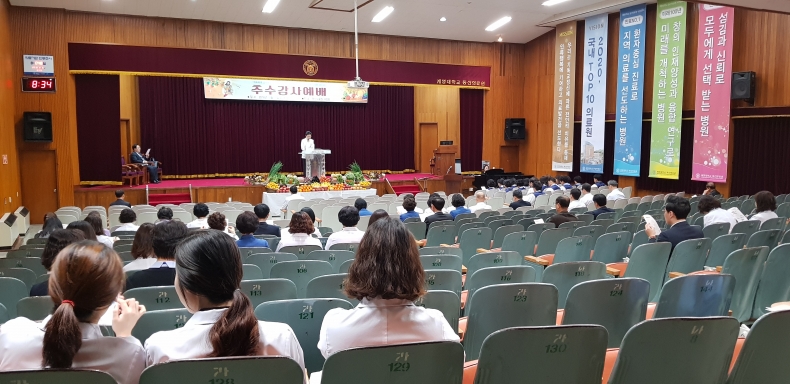 일시: 10월 31일 오전 8시30분 장소: 별관 5층 대강당 사회: 김진희 동산의료선교복지회 운영위원장 설교: 오현기 목사(동일교회) 말씀: 하나님 앞에서 감사하자(단 6:10) 과일과 채소 기부 전달 : 에덴원 양육시설(남구 봉덕동) |