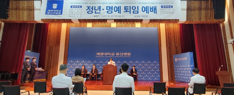 <2021년 8월 정년.명예 퇴임 예배> 1. 일시 : 2021년 8월 25일(수) 08:00 2. 장소 : 계명대학교 동산병원 5층 대강당 3. 사회, 성경봉독 및 기도 : 전세광 원목 4. 명예교수 임용장 수여 : 이세엽 의료원장 5. 공로패수여 : 이세엽 의료원장 6. 축사 : 이세엽 의료원장 7. 퇴임사 : 박정숙 교수(퇴임자 대표) 8. 선물 및 꽃다발 증정 : 의료원, 선교복지회 9. 선교복지회 선물 증정 : 조광범 선교복지회장 10. 축도 : 사회자 |