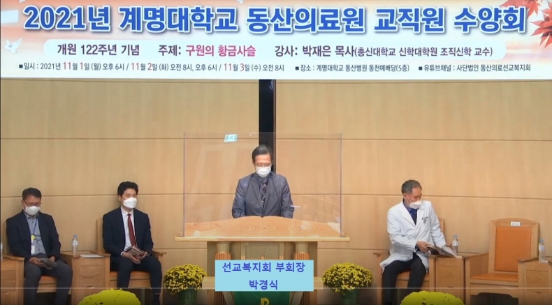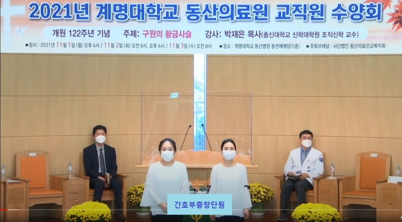저희 병원 개원 122주년을 맞이하였고 교직원분들을 위한 수양회를 아래와 같이 개최하였습니다. <2021년 교직원 수양회> 1. 일시 : 2021년 11월 1일(월) 오후 6시 2일(화) 오전 8시, 오후 6시 3일(수) 오전 8시 2. 주제 : “구원의 황금 사슬” (로마서 8:30) 3. 장소 : 계명대학교 동산병원 동천예배당(5층) 4. 강사 : 박재은 목사(총신대학교 신학대학원 조직신학 교수) |